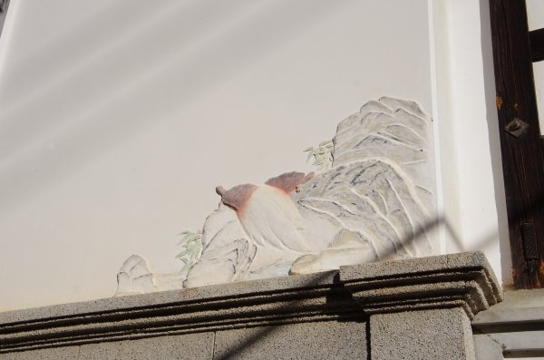 こちらの丑鼻は「二宮金次郎」、鏝絵としては初めて見る題材です。勤勉が家の繁栄につながるということでしょうね。金次郎が開いている本には制作した左官職人:宮坂氏の名前が記されています。この面の妻壁にも鏝絵が、南側は亀、北側には鶴です。